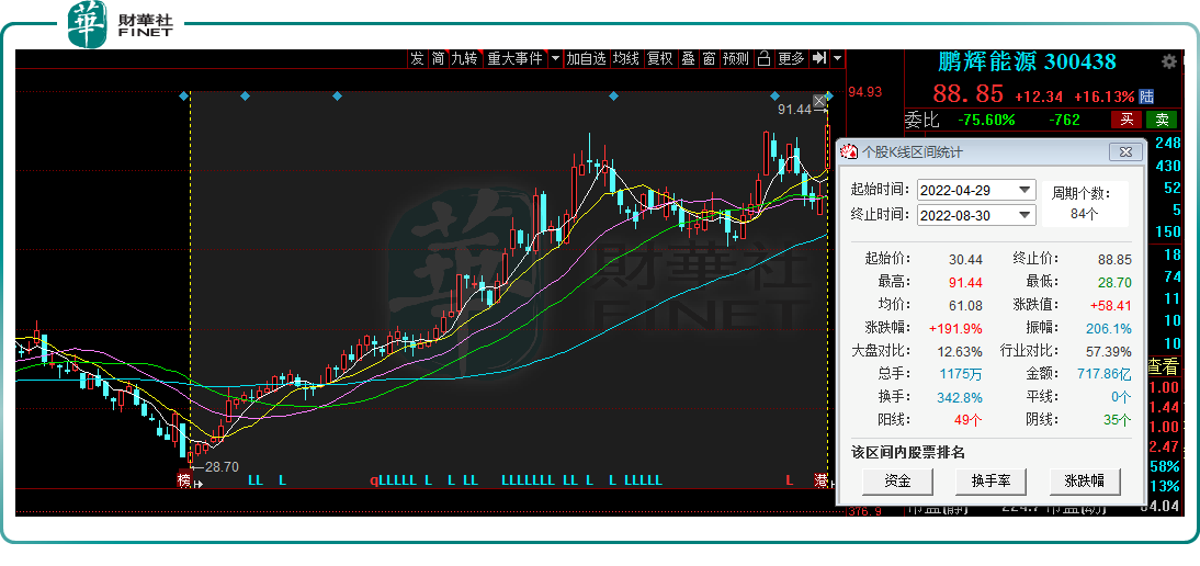 在储能产业强盛市场需求下,相关上市企业迎来了戴维斯双击,股价及业绩均上演翻倍好戏。以8月30日入选龙虎榜的鹏辉能源(300438.SZ)为例,上半年股价及业绩均实现了翻倍。