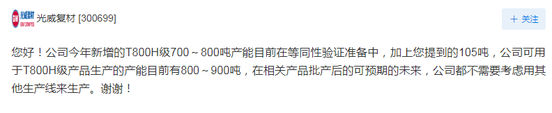 9月12日,光威复材(300699.CN)在深交所互动易平台表示,公司今年新增的T800H级700~800吨产能目前在等同性验证准备中,加上您提到的105吨,公司可用于T800H级产品生产的产能目前有800~900吨,在相关产品批产后的可预期的未来,公司都不需要考虑用其他生产线来生产。