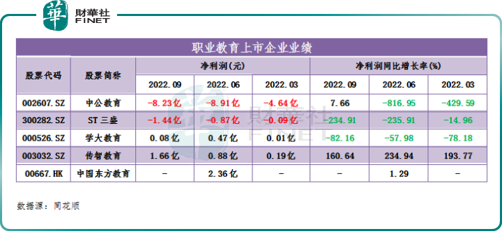表现在业绩层面,作为“公考第一股”的中公教育(002607.SZ)受到了疫情、行业竞争等因素影响,今年前三季度实现归属股东净亏损达8.23亿元,去年同期亏损8.91亿元。