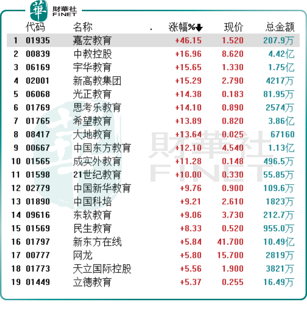 港股市场中,嘉宏教育(01935.HK)大涨46.15 %,中教控股(00839.HK)涨近17%,思考乐教育(01769.HK)、希望教育(01765.HK)、新东方在线(01797.HK)、天立国际控股等纷纷跟涨。