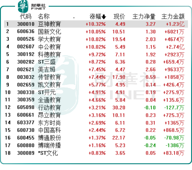 截至收盘,A股包括国新文化(600636.SH)、中公教育(002607.SZ)在内的3只个股涨停,豆神教育(300010.SZ)、科德教育(300192.SZ)等教育概念股纷纷拉涨。