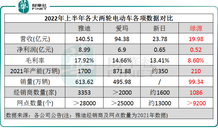 上图可以看到,无论是在营收、利润,还是在产能、销量及门店网点数量等层面,绿源均被雅迪和爱玛甩得老远。