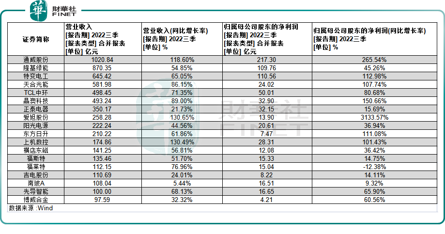 根据Wind数据统计,光伏产业链上游的通威股份(600438.SH)今年前三季度业绩大爆发,营收和净利润分别同比大增1.19倍及2.66倍。