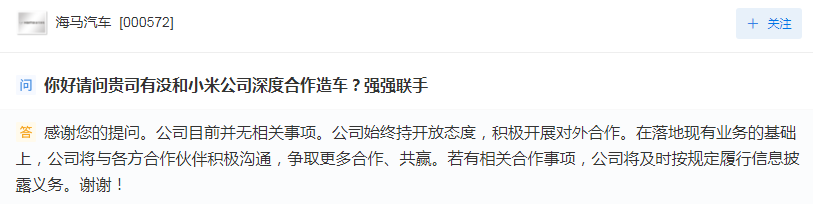 1月29日,海马汽车(000572.CN)在互动平台回复投资者提问有没和小米公司深度合作造车?表示,公司目前并无相关事项。公司始终持开放态度,积极开展对外合作。在落地现有业务的基础上,公司将与各方合作伙伴积极沟通,争取更多合作。