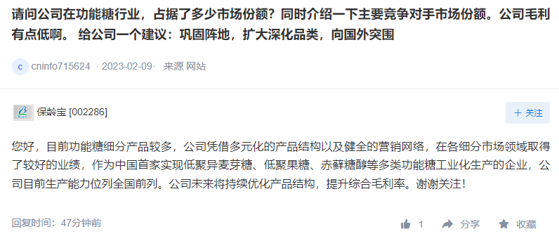 中国财富通3月2日 - 保龄宝(002286)在互动平台上表示,目前功能糖细分产品较多,公司凭借多元化的产品结构以及健全的营销网络,在各细分市场领域取得了较好的业绩,作为中国首家实现低聚异麦芽糖、低聚果糖、赤藓糖醇等多类功能糖工业化生产的企业,公司目前生产能力位列全国前列。公司未来将持续优化产品结构,提升综合毛利率。