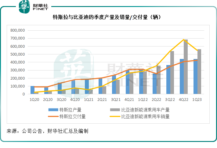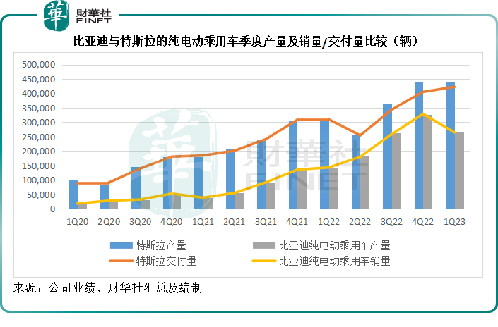中国的新能源汽车生产商比亚迪(01211.HK,002594.SZ)也公布了2023年3月及2023年第1季产销量数据。虽说新能源车产销量依然领先于特斯拉,但比亚迪的纯电动汽车产销量依然低于特斯拉。