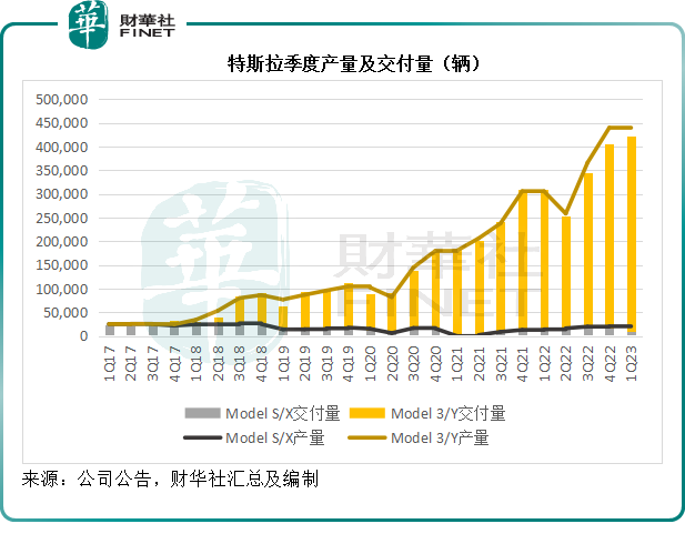 交付量的增速似乎并未跟上产量的同比增长,2023年第1季的总交付量按年增长36.39%,至42.29万辆,其中Model 3/Y交付量按年增长39.57%,至41.22万辆,抵消了Model S/Y交付量按年下降27.36%的影响。