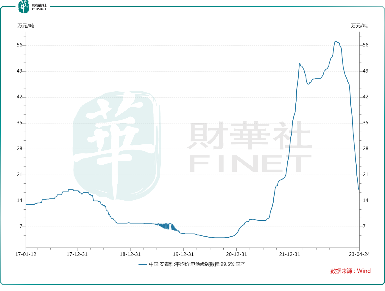 步入2023年,锂价格走势更是急转直下,截至4月24日,电池级碳酸锂市场价格约为17万元/吨,较年初跌幅超6成。