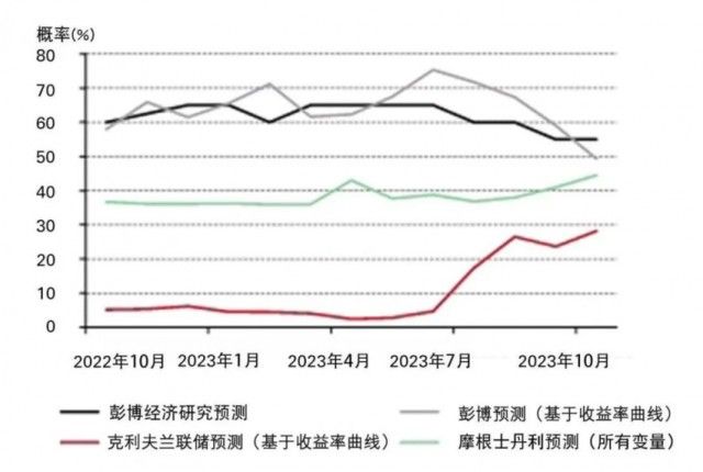 *数据截至2023年11月。这些指标包括彭博经济、彭博10年-2年曲线型指标、克利夫兰联储18个月-3个月曲线指标和摩根士丹利对未来12个月所有变量的估算。
