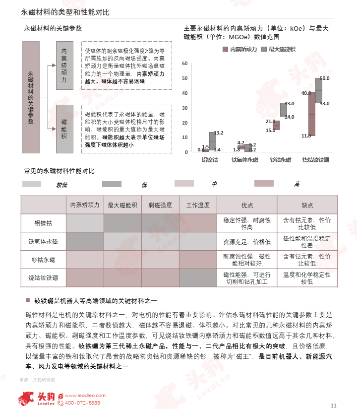 磁性材料是电机的关键原材料之一,对电机的性能有着重要影响。对比常见的几种永磁材料的内禀矫顽力、磁能积、剩磁强度和工作温度参数,可见钕铁硼具有极强的性能,且价格低廉,广泛应用于机器人、新能源汽车等场景中。