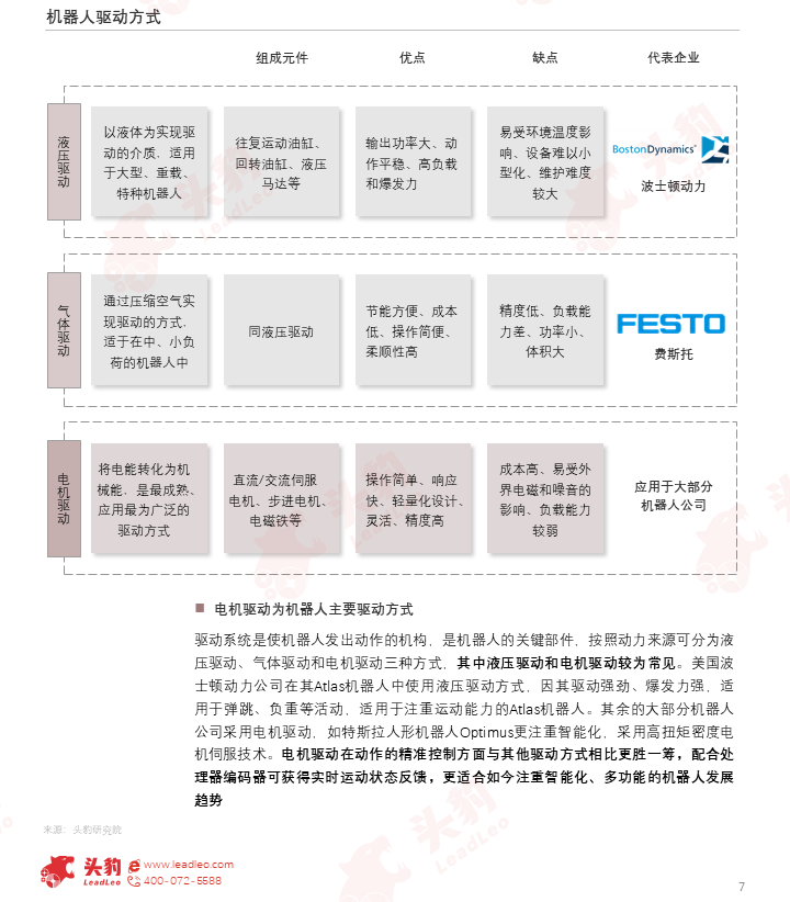 驱动系统是使机器人发出动作的机构,是机器人的关键部件,按照动力来源可分为液压驱动、气体驱动和电机驱动三种方式,其中液压驱动和电机驱动较为常见。