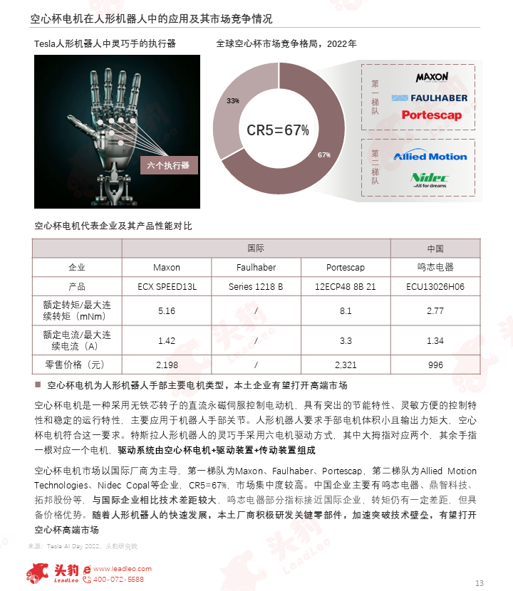 空心杯电机市场以国际厂商为主导,市场集中度较高,本土企业与国际企业相比技术差距较大。随着人形机器人的快速发展,本土厂商积极研发关键零部件,加速突破技术壁垒,有望打开空心杯高端市场。
