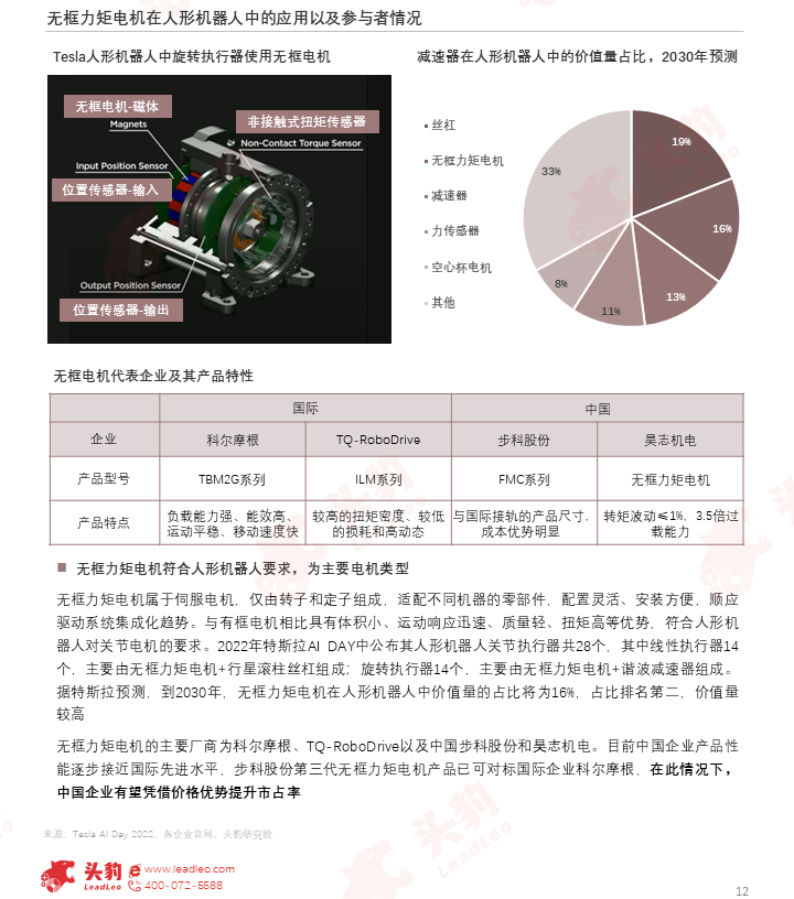 根据特斯拉AI DAY公布的信息,其人形机器人主要应用无框力矩电机和空心杯电机,二者具有体积小、运动响应迅速、质量轻、扭矩高等优势,符合人形机器人对电机的要求。