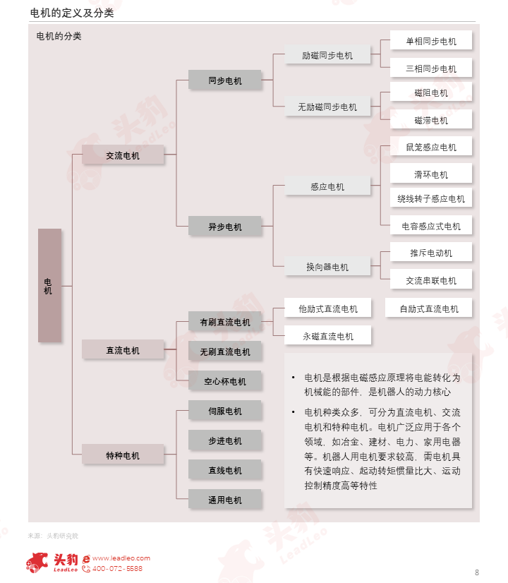 电机是根据电磁感应原理将电能转化为机械能的部件,是机器人的动力核心,可分为直流电机、交流电机和特种电机。