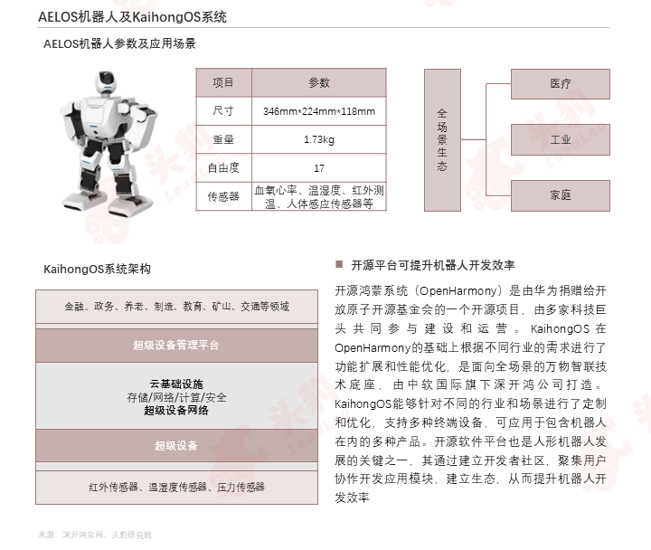 同样在2023年11月17日,又一款人形机器人发布,是深开鸿和乐聚机器人合作研发的首款基于开源鸿蒙系统的专业级人形机器人AELOS鸿蒙版。