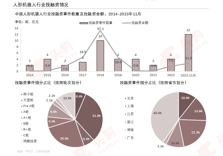 2014-2023年11月,人形机器人行业相关投融资事件共47起,其中2018年为第一个高峰,投融资事件达10起,投融资金额达最高峰,为57.1亿元,主要在于优必选完成8.2亿美元C轮融资,刷新了AI领域单轮融资纪录。