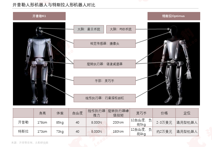 2023年11月17日,开普勒发布人形机器人先行者系列,对标特斯拉人形机器人,其定位、功能、定价及零部件选用等方面与特斯拉Optimus相似度较高。