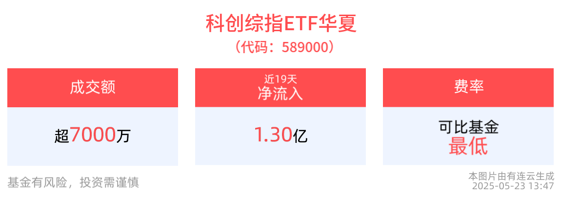 截至2025年5月23日 13:47,上证科创板综合指数(000680)上涨0.26%,成分股阳光诺和(688621)上涨17.40%,皖仪科技(688600)上涨14.11%,映翰通(688080)上涨13.49%,兰剑智能(688557)上涨9.01%,爱科赛博(688719)上涨8.87%。科创综指ETF华夏(589000)上涨0.11%,最新价报0.93元。流动性方面,科创综指ETF华夏盘中换手2.81%,成交7643.30万元。拉长时间看,截至5月22日,科创综指ETF华夏近1月日均成交1.75亿元,居可比基金第一。资金流入方面来看,科创综指ETF华夏近19个交易日净流入1.30亿元。