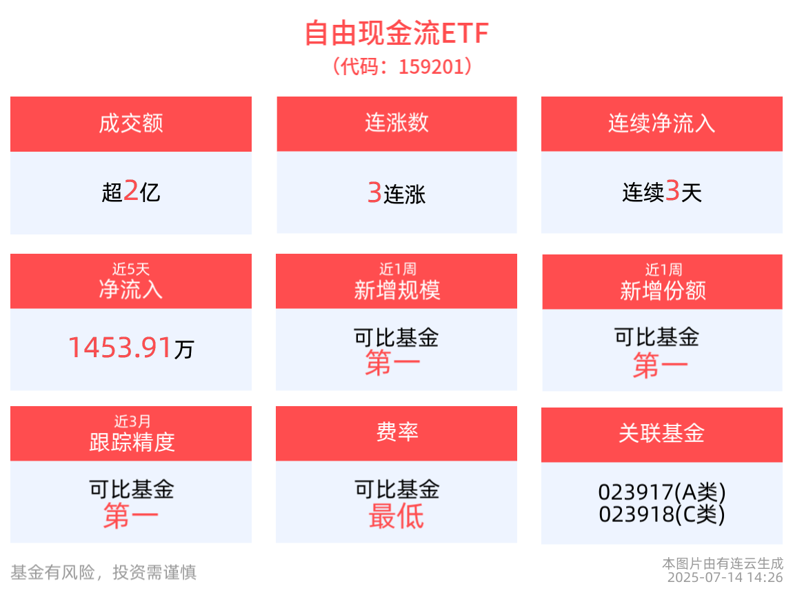 跟踪精度方面,截至2025年7月11日,自由现金流ETF近3月跟踪误差为0.094%,在可比基金中跟踪精度最高。