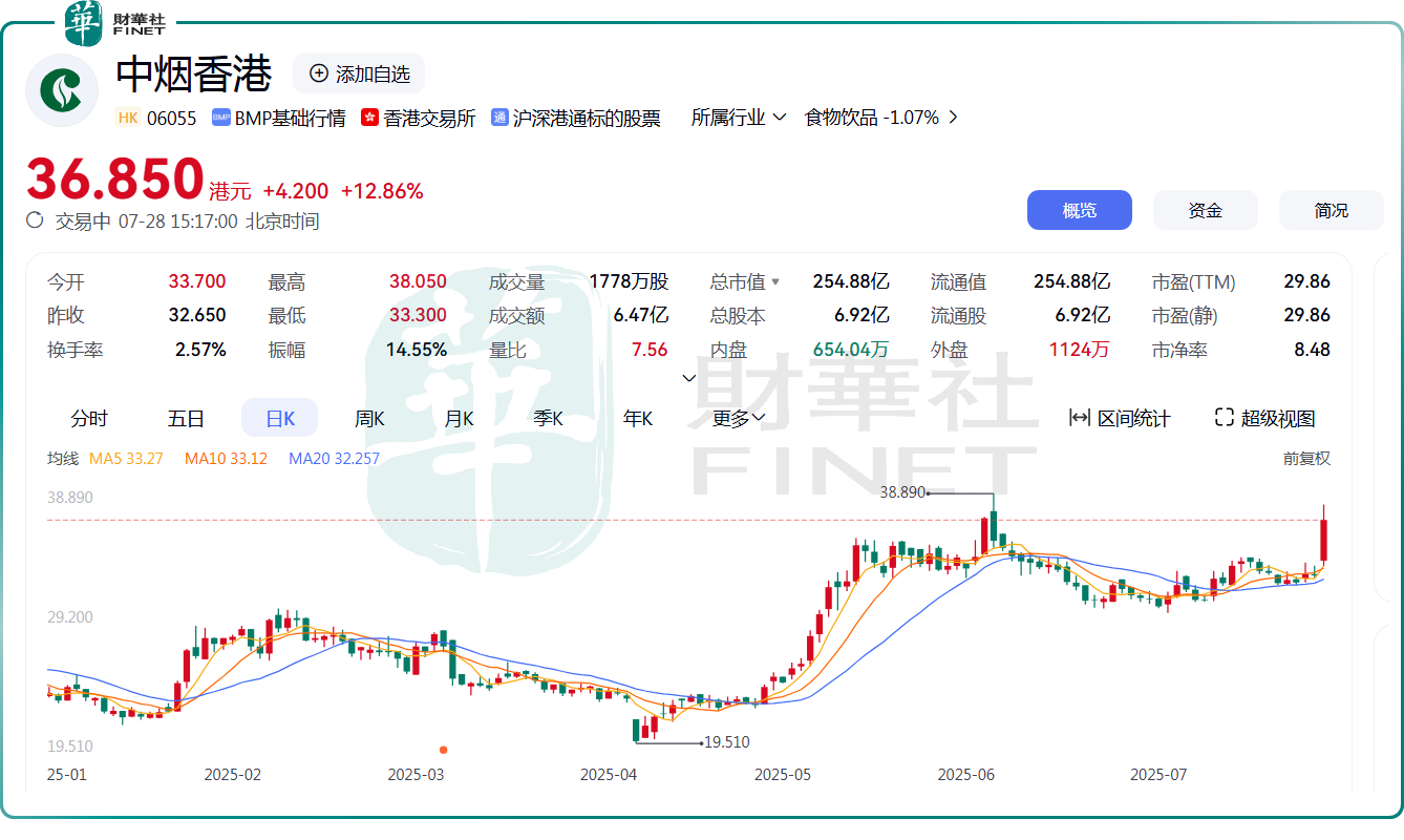 7月28日,中烟香港(06055.HK)股价放量大涨,盘中一度涨16.54%,截至发稿前,涨幅为12.86%,报36.85港元/股。