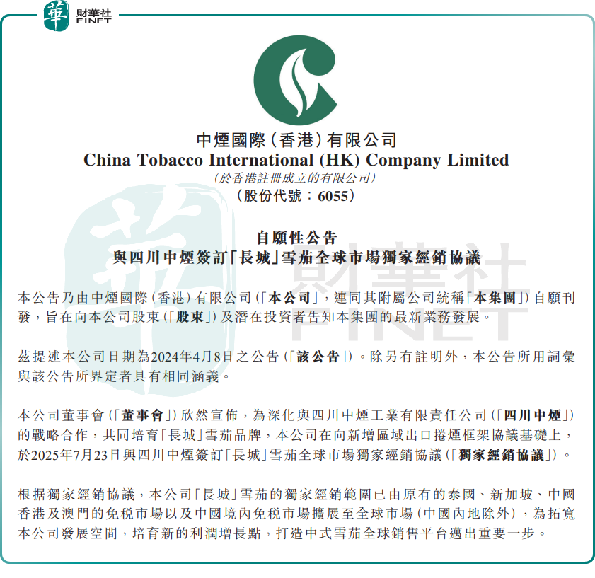 国金证券研报亦强调,继续重视中烟香港作为中烟体系的国际业务拓展及资本运作平台的布局价值。