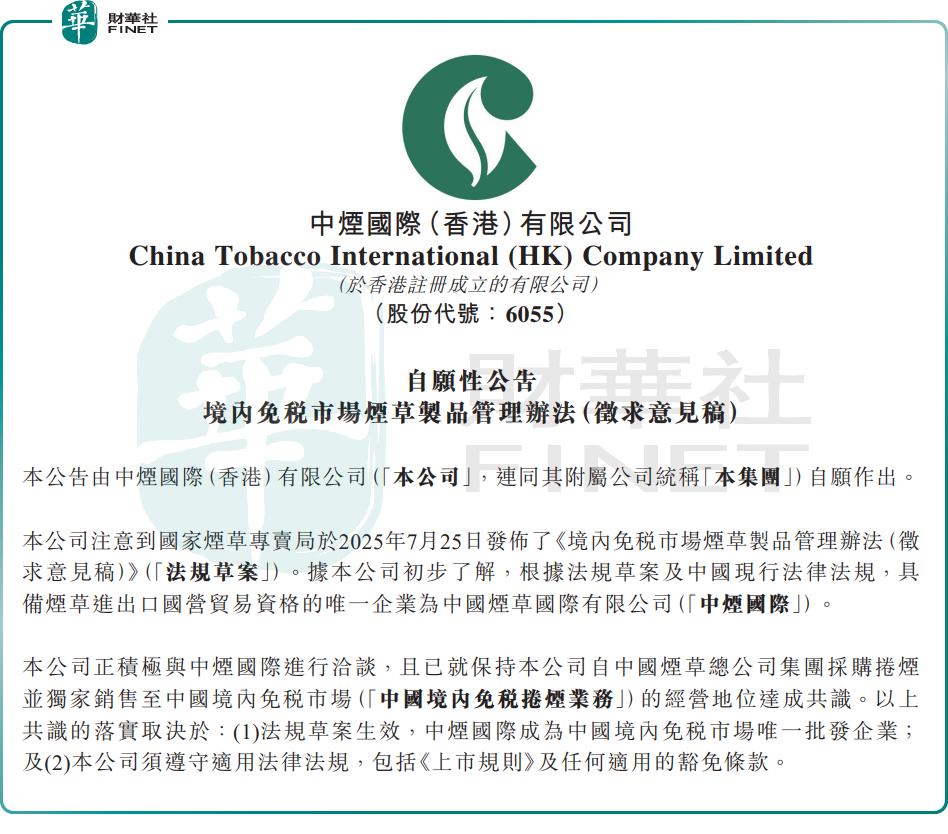 7月27日,中烟香港发布公告称,公司注意到国家烟草专卖局于2025年7月25日发布了《境内免税市场烟草制品管理办法(征求意见稿)》(法规草案)。根据法规草案,具备烟草进出口国营贸易资格的唯一企业为中烟国际。