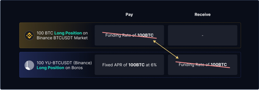 Pendle在Arbitrum上构建了全新平台Boros,核心功能是将永续合约中高度波动的资金费率转化为可交易的代币化工具——收益单元(Yield Units, YUs)。每个YU代表1单位抵押资产(如BTC/ETH)在特定期限内的收益权(如1 YU-ETH代表1 ETH名义价值的收益,直至到期)。Boros的机制参考了Pendle V2中代表未来收益权的YT(Yield Token),逻辑也类似于TradFi的利率衍生品。