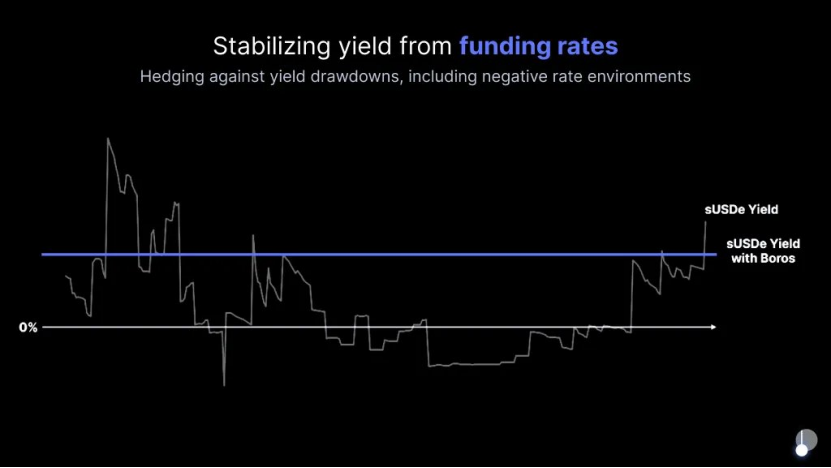 虽然Ethena仓位保持Delta-Neuteal,但其仍需承担交易所收取的资金费率,同时也是Ethena的营收来源之一。当资金费率为正(多头OI > 空头OI)时,因多头向空头支付资金费率,Ethena会盈利;然而,当融资利率为负(空头OI > 多头OI)时,Ethena则将亏损。此时,Boros可作为关键的“减震器”,助其缓解负资金费率带来的风险,平滑收益曲线。