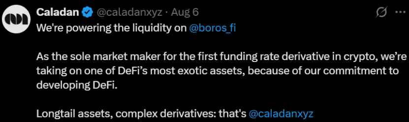 Boros在初期仅开设了币安的BTC与ETH永续合约资金费率市场,未来计划逐步拓展到更多主流永续合约平台(如Bybit、Hyperliquid、Bybit)和高流动性资产(如SOL、BNB)。知名做市商Caladan表示正在为Boros提供流动性。