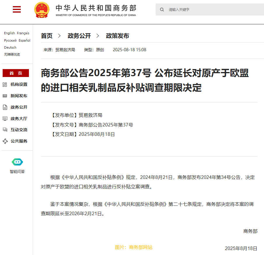 【财华社讯】8月18日,商务部网站发布,根据《中华人民共和国反补贴条例》规定,2024年8月21日,商务部发布2024年第34号公告,决定对原产于欧盟的进口相关乳制品进行反补贴立案调查。鉴于本案情况复杂,根据《中华人民共和国反补贴条例》第二十七条规定,商务部决定将本案的调查期限延长至2026年2月21日。