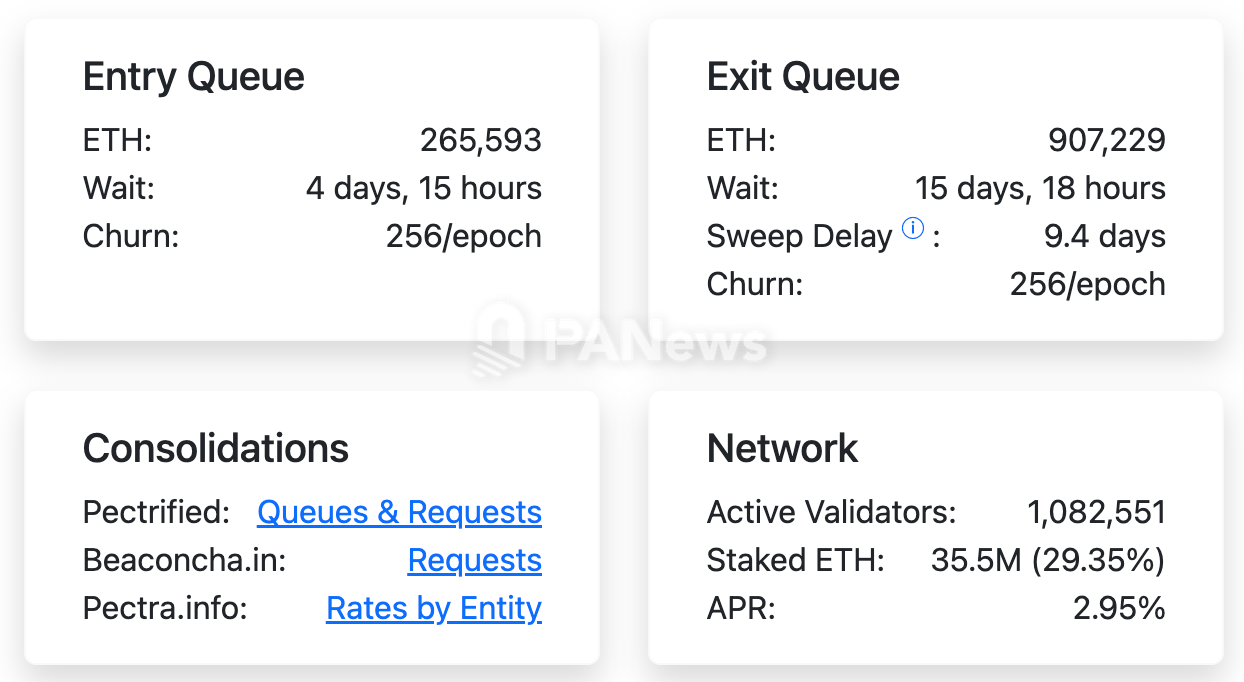 PANews 8月19日消息,据validatorqueue网站数据,截至目前,以太坊PoS网络退出队列ETH数量增至907,229枚,排队退出等待时间约15天18小时。同期,待进场ETH为265,593枚,预计激活延迟约4天15小时。