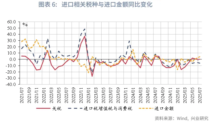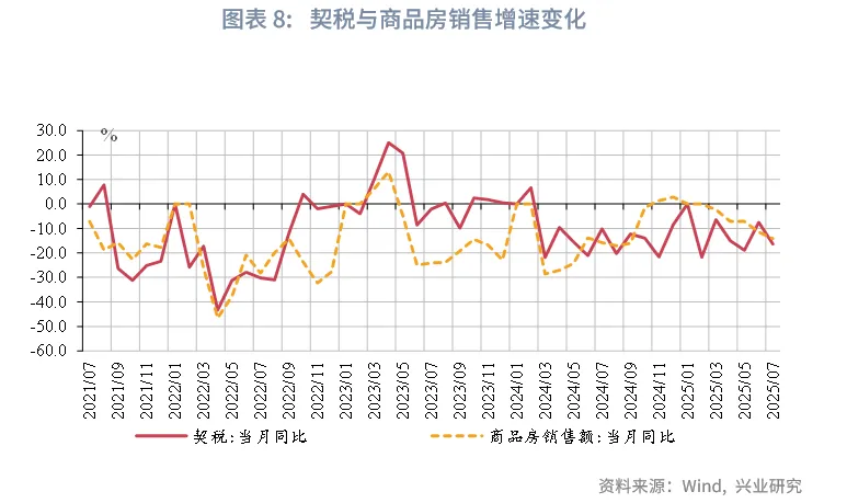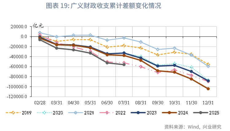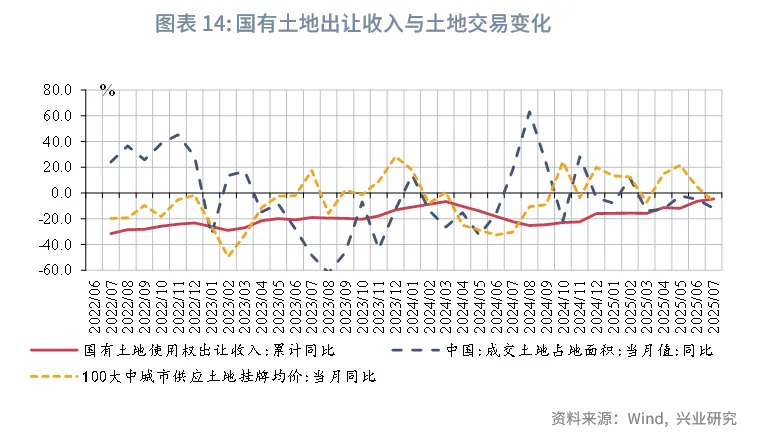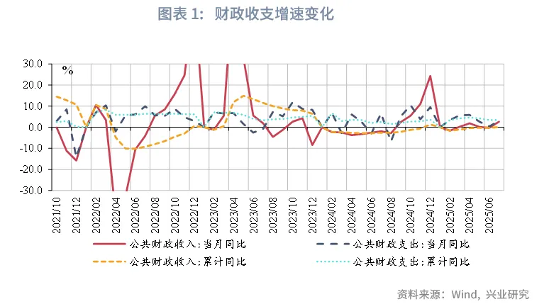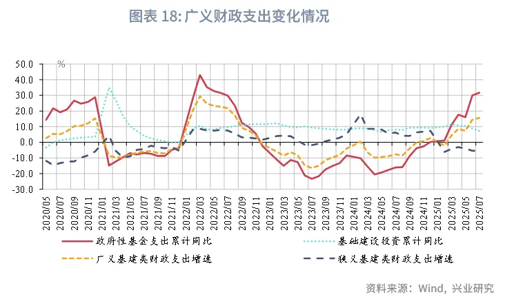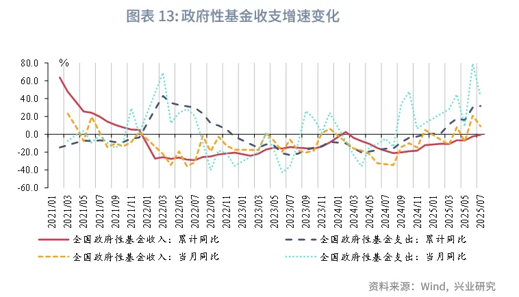 2025年7月,财政收入同比转正,受益于税收收入增速上行,财政支出有所增长;政府性基金收入受国有土地出让收入下降拖累,支出增速有所下行,但仍保持较高增速。
