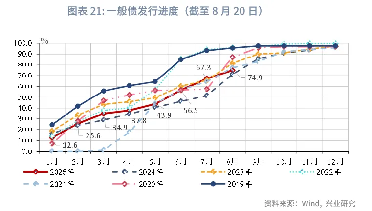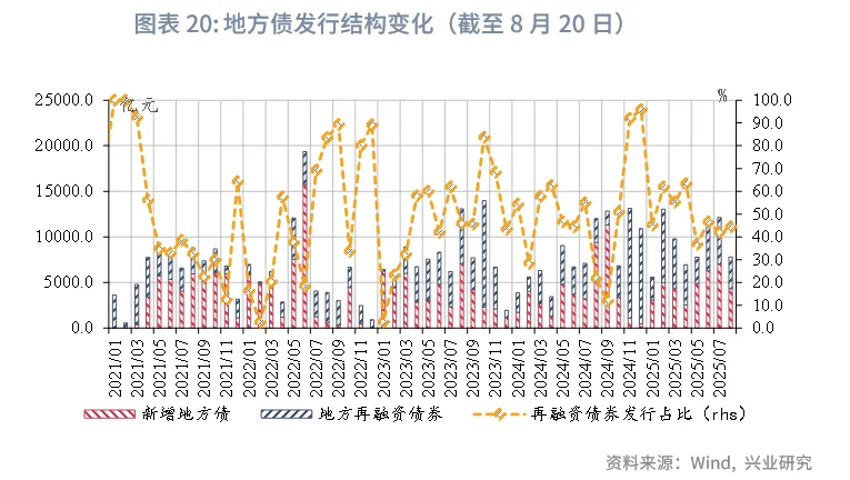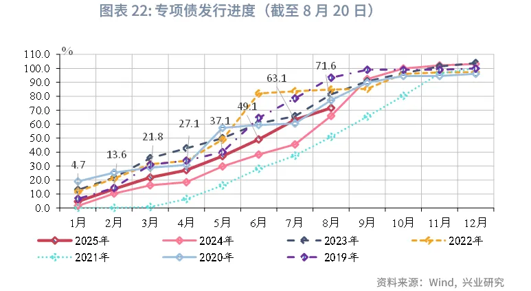 从发行进度看,截至8月20日,新增专项债发行进度约为71.6%,已高于2024年8月进度水平。特殊再融资专项债累计发行1.94万亿元,已占当年新增额度2万亿元的96.8%。