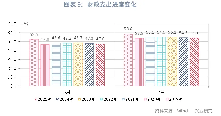 从一般公共预算支出来看,财政支出增速上行。7月财政支出当月同比增速录得3.0%,上升2.7个百分点,支出进度为54.1%,低于2024年同期0.3个百分点。受收入端上升的带动,支出端有所改善。