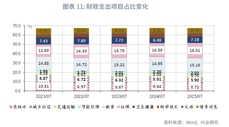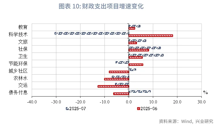 从财政支出资金投向来看,7月民生类支出持续发力,基建类支出增速降幅收窄。在民生类支出方面,社保、卫生支出仍保持较高增速,分别录得13.1%、14.2%;科学技术支出降幅较大,当月同比录得-30.5%,主要源于前期投入较大,月度间有所调整。基建类支出方面,除节能环保支出增速下降至-5.3%外,城乡社区、交运、农林水支出增速分别自低位上升至2.9%、-5.5%、-6.9%。从支出占比来看,考虑到支出执行进度半年度考核等扰动消退,7月基建类支出占比下降至20.3%;民生类支出占比上升至38.4%。
