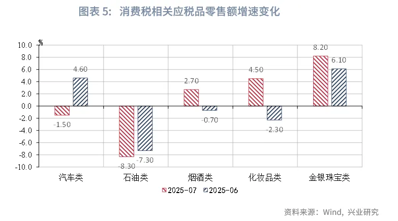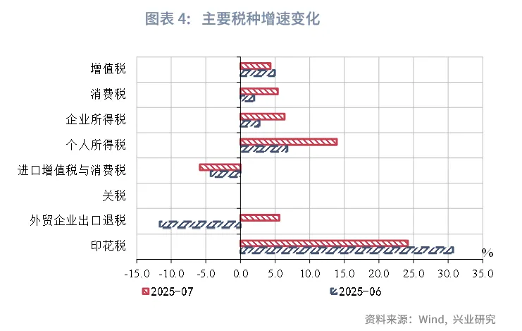 在税种结构方面,7月印花税、企业所得税、个人所得税、消费税为主要支撑,进口增值税为主要拖累项。在直接税方面,企业所得税同比增速约为6.4%,较6月上升3.6个百分点,或受基数偏低的影响。个人所得税同比13.9%,较6月上升7.2个百分点,或受股市分红、红利税的拉动。在间接税方面,增值税、印花税仍为主要支撑。增值税当月同比增速录得4.3%,较6月下降0.6个百分点,或受PPI降幅较大的影响。印花税当月同比增速24.2%,其中,证券交易印花税增速125.4%,增速创年内新高,高增速反映证券交易持续活跃。消费税当月同比增速录得5.4%,较6月上升3.4个百分点,金银珠宝、汽车类应税消费品表现亮眼,同时去年7月基数较低。