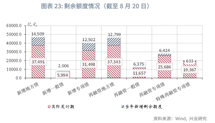 从剩余额度来看,截至8月20日,新增一般债、新增专项债剩余额度分别约0.20万亿元、1.25万亿元,特殊化债专项债额度剩余约0.06万亿元。