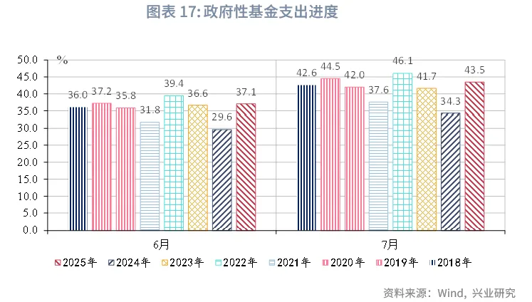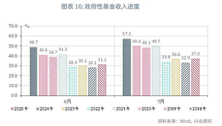 从收支进度来看,收入进度略高于2024年同期,支出进度受债券资金补充明显高于2024年同期,但边际有所放缓。7月政府性基金收入进度为37.0%,较2024年同期高4.1个百分点;支出进度43.5%,较2024年同期高9.2个百分点。