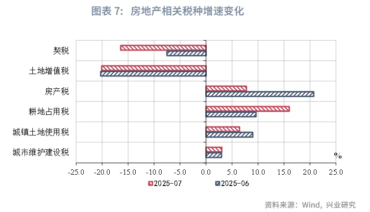 在土地和房地产相关税种方面,税收支撑格局相对稳定,主要由房产税、耕地占用税、城镇土地使用税支撑。房产税、城镇土地使用税当月同比增速分别为7.8%、6.4%。契税、土地增值税降幅仍然较大,分别录得-16.4%、-20.0%。