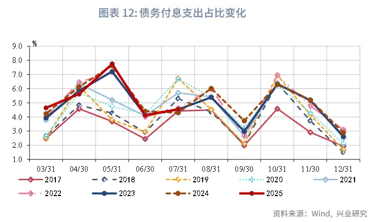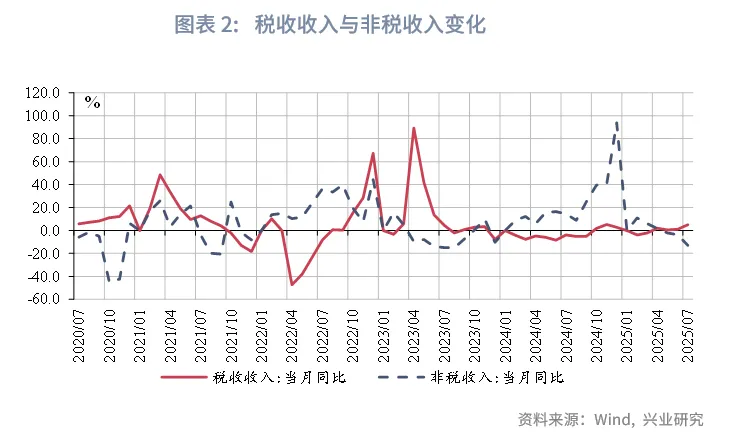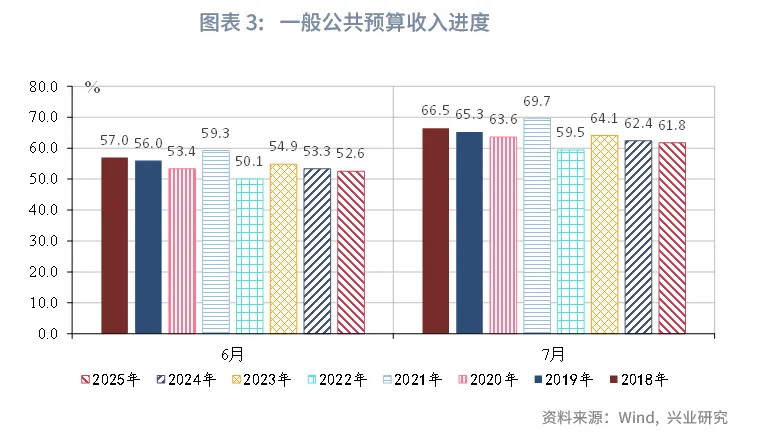 财政收入同比增速止跌转正,税收收入拉动明显,非税收入降幅扩大。2025年7月财政收入同比增速较6月有所上升,当月同比增速2.7%,上升3.0个百分点。其中,税收收入增速上升4.0个百分点,当月同比增速5.0%,或源于主要税种的改善与税收征管的加强;非税收入增速降幅扩大9.2个百分点,录得-12.9%。从收入进度来看,7月收入进度约61.8%,低于2024年同期0.6个百分点,处于同期偏低水平。