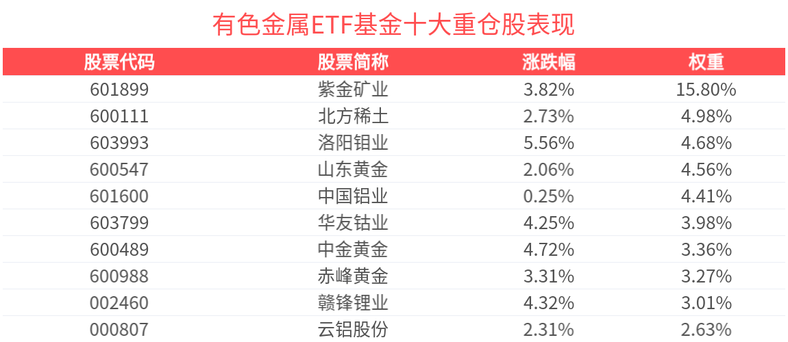 有色金属ETF基金紧密跟踪中证细分有色金属产业主题指数,截至2025年7月31日,指数前十大权重股分别为紫金矿业、北方稀土、洛阳钼业、华友钴业、中国铝业、山东黄金、中金黄金、赣锋锂业、天齐锂业、赤峰黄金,前十大权重股合计占比50.84%。