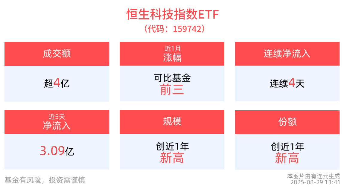 截至8月28日,恒生科技指数ETF近3年净值上涨34.75%。从收益能力看,截至2025年8月28日,恒生科技指数ETF自成立以来,最高单月回报为33.70%,最长连涨月数为4个月,最长连涨涨幅为23.01%,上涨月份平均收益率为7.44%。
