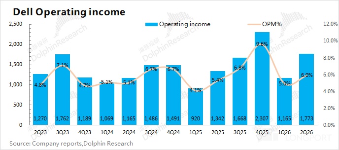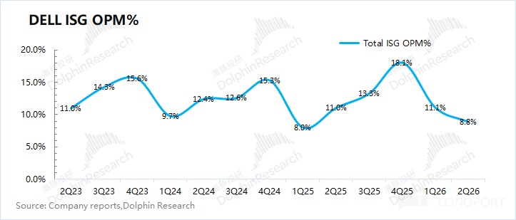 即使在 AI 服务器出货增长的情况下,戴尔公司给自身的长期营收增速也仅有 3-4%。ISG 业务的经营利润率,在近两个季度已经回落至 10% 以下。换句话说,即使 AI 业务放量,在这么低的利润率情况下,也很难带来利润端的大量释放。