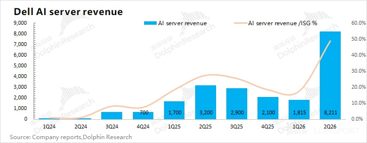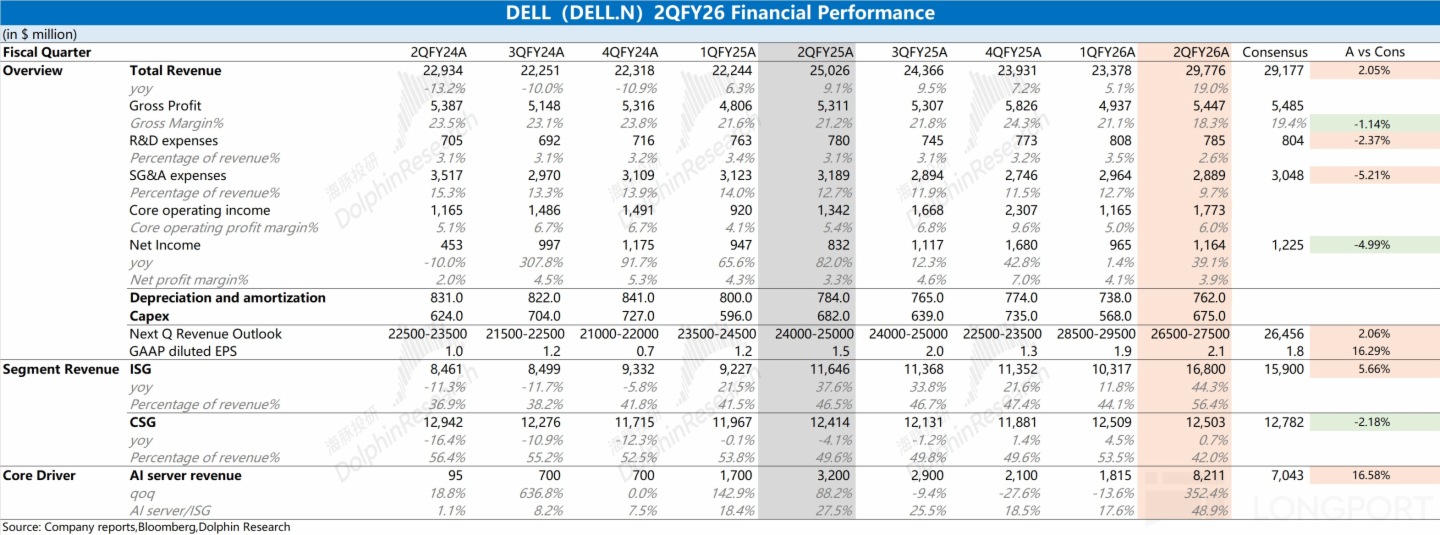 2.ISG 业务(基础设施解决方案):$戴尔科技-C(DELL.US) 本季度收入 168 亿美元,环比增长 65 亿美元,好于市场预期(159 亿美元)。本季度的环比增量,都来自于 AI 服务器的带动。