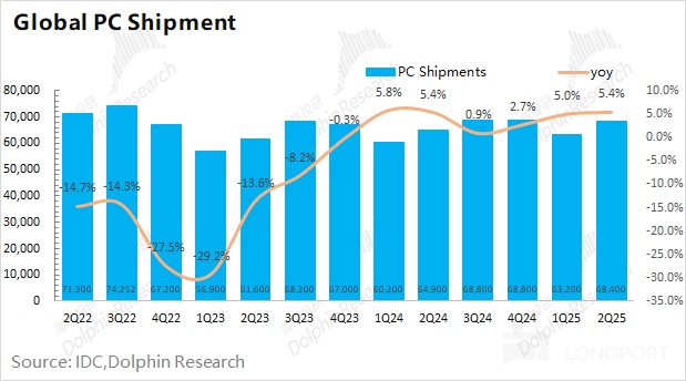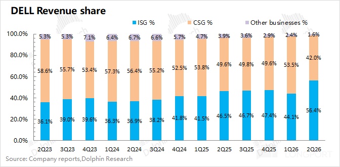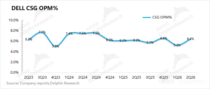 3.CSG 业务(客户端解决方案):本季度收入 125 亿美元,同比基本持平,低于市场预期(128 亿美元)。在 CSG 业务中,主要受 PC 个人电脑相关需求的影响。结合 PC 市场数据看,戴尔公司本季度出货量同比略有下滑,在全球市场中依然排在第三位。