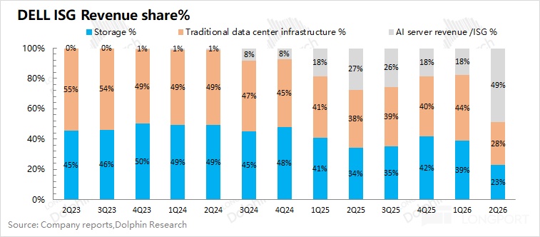 ②其他部分:除 AI 服务器以外,ISG 其他业务大约贡献了 47 亿美元收入,环比增长 5%。其中传统服务器业务受季节性因素有所提升,而存储业务环比有所回落。