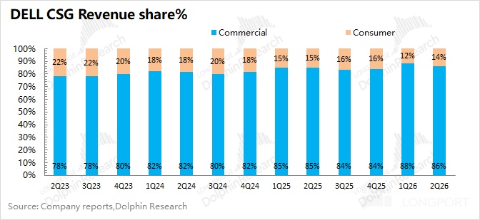 具体来看:戴尔公司的客户端业务仍以商用客户为主。本季度商用客户收入为 107 亿美元,同比增长 2%;而个人消费者端的收入仅为 17 亿美元,同比下滑 7%。