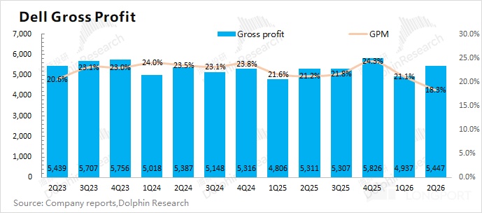 戴尔公司本季度营收端表现还不错,但毛利率走低也直接压制了利润端的释放。公司本季度的收入增量基本都来自于 AI 服务器的带动,但同时也导致公司整体毛利率的下滑。