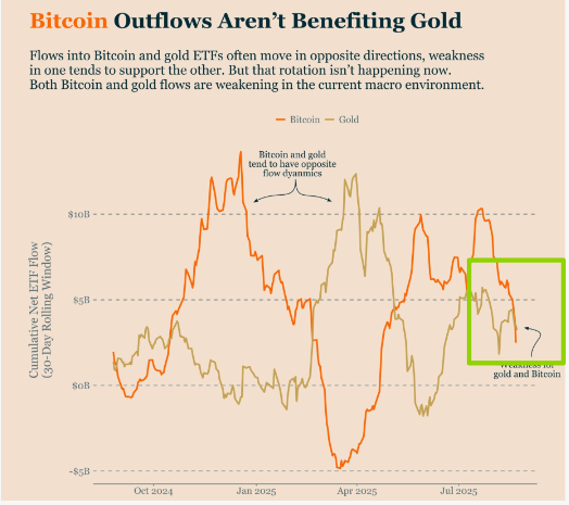 PANews 8月31日消息,据CryptoSlate报道,比特币和黄金ETF本月趋势与历史趋势出现偏离,比特币和黄金资金流没有像通常那样朝相反方向流动,而是同时出现流出。数据显示,比特币ETF连续六天出现资金流出,仅8月底就流出了近20亿美元,同时GLDM等主要黄金ETF资金流出也大幅增加,仅一周就流出了4.49亿美元,这种罕见的资金同步流出现象反映出当前宏观经济环境和投资者心理的变化,即:比特币的资金外流并没有给黄金带来好处,在美联储明确政策路径之前,这两种资产都将面临压力。