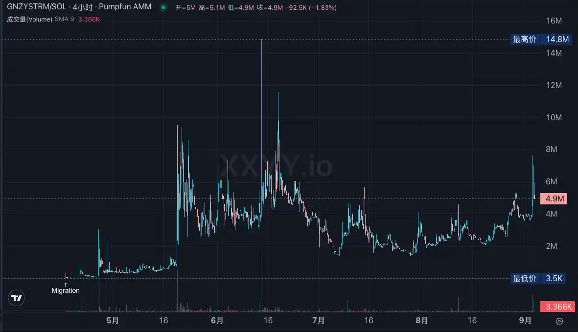 他的代币 GNZYSTRM 自 4 月份上线后价格稳步上涨,基本在 200 万市值到 500 万市值浮动。